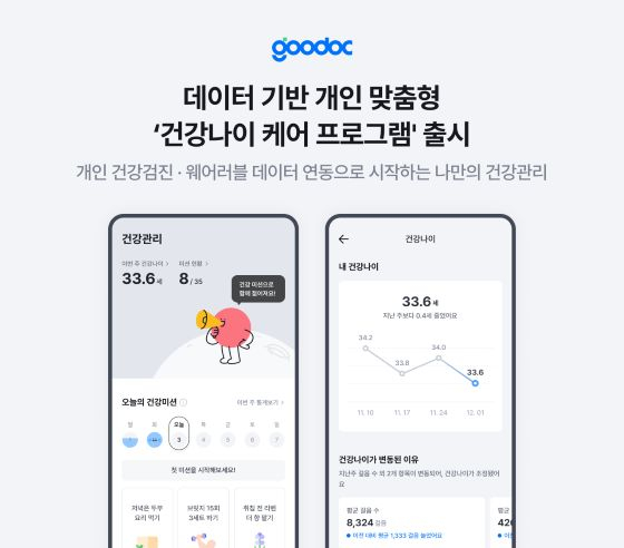 병원 진료 접수·예약 및 비대면진료 플랫폼 굿닥이 개인 건강 데이터를 기반으로 일상 속 맞춤형 건강관리를 지원하는 '건강나이 케어 프로그램' 베타 버전을 5일 공개했다.