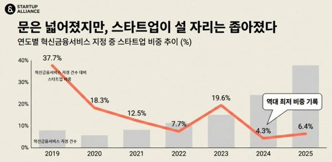 반면 지정 건수에서 차지하는 스타트업의 비중은 지속 감소했다. 2019년 37.7%에서 2020년 18.3%, 2021년 12.5%, 2022년 7.7%로 하락했다가 2023년 19.6%로 일시 반등했지만, 2024년 4.3%, 2025년 6.4%로 다시 떨어졌다.