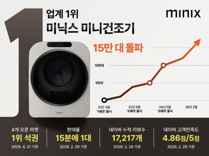 미닉스 '미니건조기'는 2021년 4월 첫 출시된 이후 브랜드를 대표하는 제품으로 자리 잡았다. 이후 출시 4년 10개월 만에 누적 15만8000여대 판매를 기록했다.