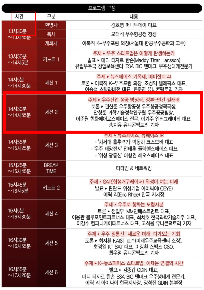 이 세션에는 권현준 우주항공청 우주항공정책국장, 안형준 과학기술정책연구원(STEPI) 우주공공팀장, 이준원 한화에어로스페이스 전무, 이기주 인터그래비티테크놀로지스 대표가 패널로 참여한다. 이들은 '우주산업 성공 방정식, 정부-민간 컬래버'를 주제로, 한국 우주산업 현안을 짚는 동시에 글로벌 뉴스페이스 시대에 최적화 된 정책 대안을 모색할 예정이다.