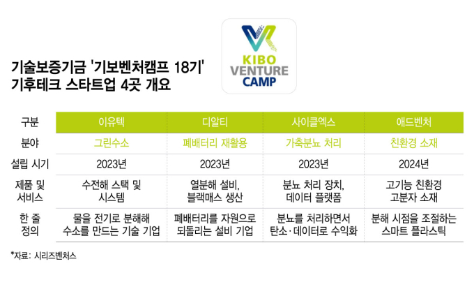 기술보증기금 '기보벤처캠프 18기' 역시 이러한 흐름을 반영했다. △그린수소 생산 △폐배터리 재활용 △가축분뇨 저탄소 처리 및 탄소배출권 연계 플랫폼 △분해 시점을 제어하는 친환경 고분자 소재 등 다양한 분야의 스타트업들이 이번 기수에 포함됐다. 이들 기업은 서로 다른 산업에 속해 있지만 '탄소 저감'을 핵심 가치로 기존 산업 구조를 재편하고 있다는 점에서 공통점을 가진다.
