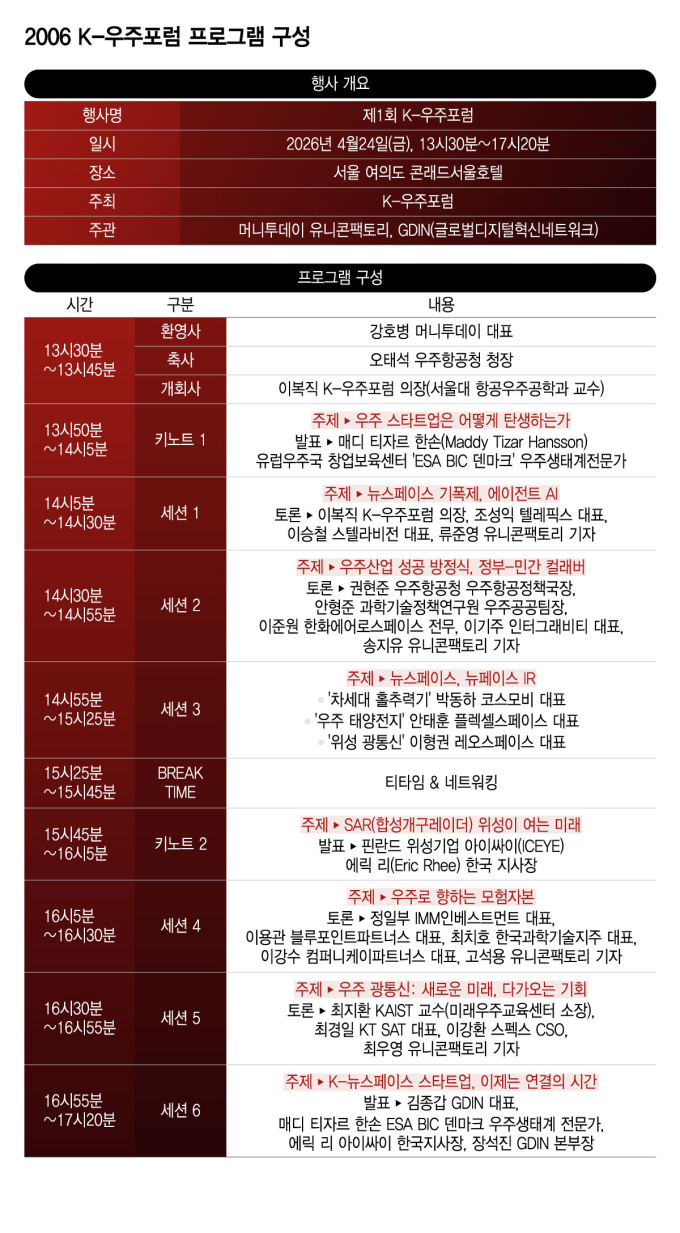 이 같은 흐름을 한눈에 조망할 수 있는 자리가 마련된다. 오는 24일 서울 여의도 콘래드호텔에서 열리는 머니투데이 글로벌 콘퍼런스 '2026 키플랫폼 특별 프로그램 K-우주포럼'이다. 이 포럼에서 특히 주목할 점은 '비즈니스 관점'에서 우주를 해석한다는 데 있다. 위성 데이터를 활용해 실제 산업 문제를 해결하고 있는 스타트업과 국내외 전문가들이 참여해 데이터가 어떻게 새로운 수익모델로 전환되는지를 구체적인 사례를 통해 제시할 예정이다.