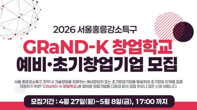 서울홍릉강소특구·티비즈와 함께 진행하는 GRaND-K 창업학교는 기술창업을 꿈꾸는 예비 창업자부터 창업 3년 미만의 초기 기업까지 전주기 성장을 지원하는 투자 연계형 액셀러레이팅 프로그램이다. 예비 창업자의 경우 프로그램 종료 전까지 창업할 수 있어야 한다.